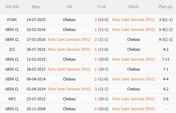 PSG và Chelsea đã có nhiều lần chạm trán trong quá. Những trận đấu giữa họ luôn diễn ra vô cùng kịch tính. Lần gần nhất Chelsea đã thắng đậm PSG với tỷ số 3-0. Đó là trận chung kết FIFA Club World Cup đầy bất ngờ. Kết quả đó là cú sốc lớn với người hâm mộ Paris.